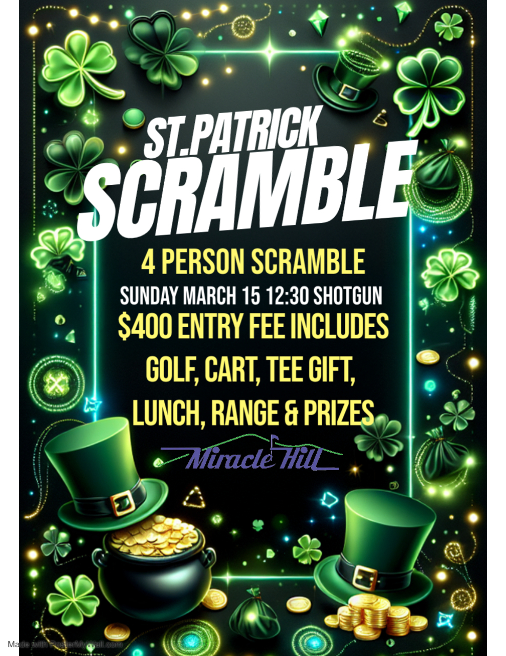 We are hopeful for an early spring and some luck of the Irish as we will play host to a St. Patrick's Day Golf Scramble Sunday March 15th at 12:30.